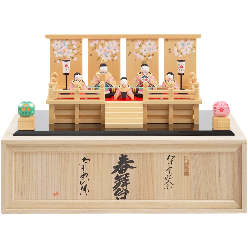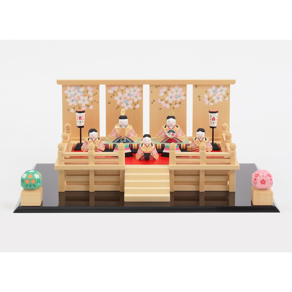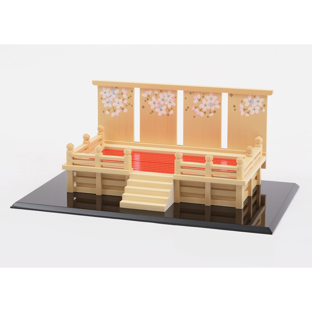 華やかさを醸し出す舞台の上にお人形を配することで、女雛と男雛、三人官女の存在感が一層引き立てられます。