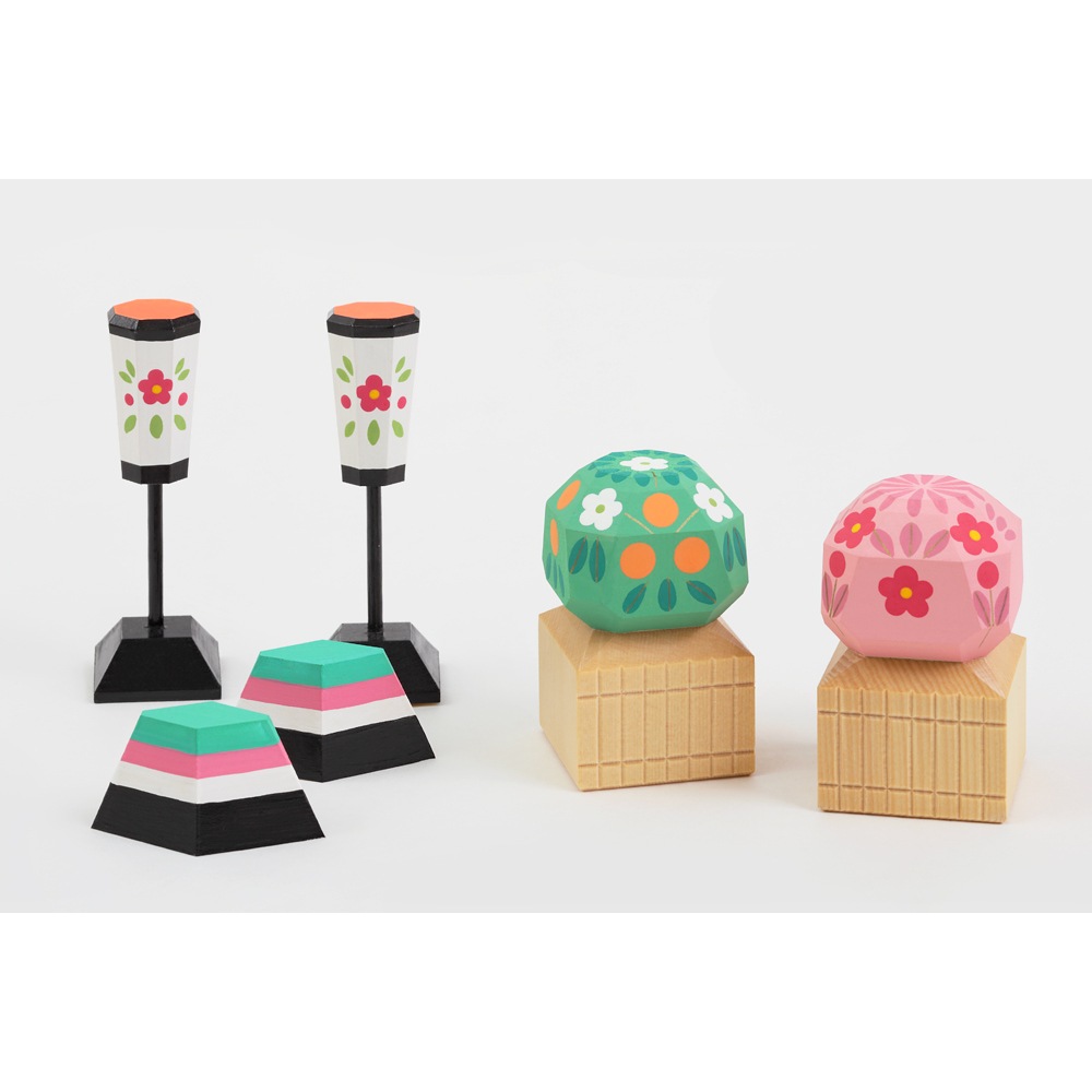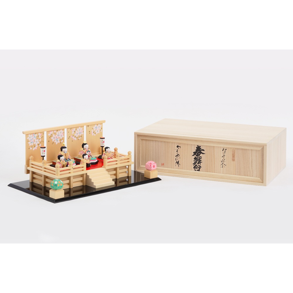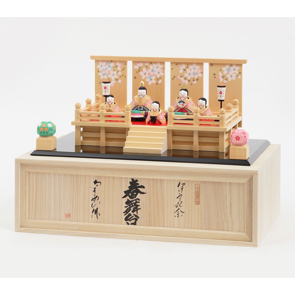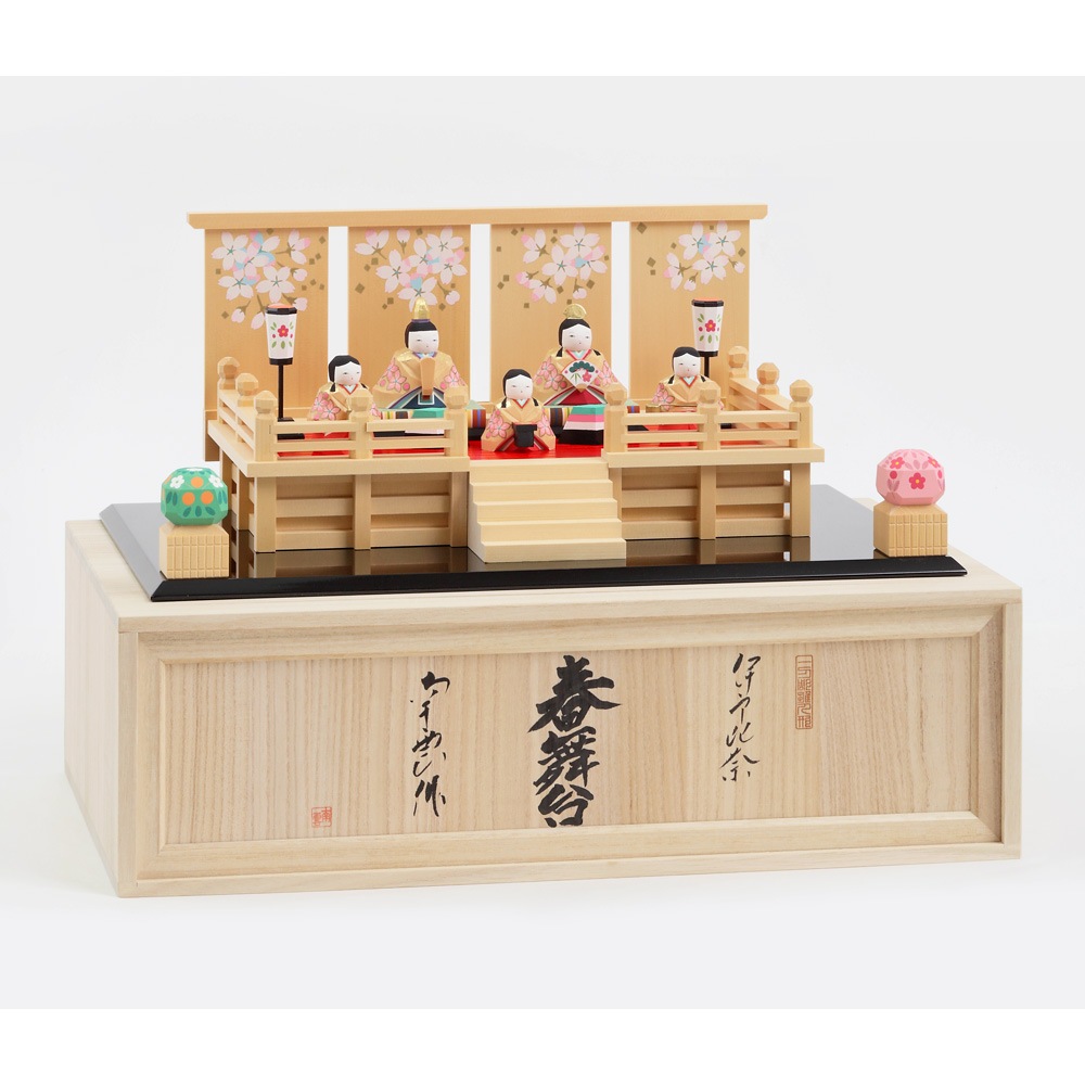 華やかさを醸し出す舞台の上にお人形を配することで、女雛と男雛、三人官女の存在感が一層引き立てられます。