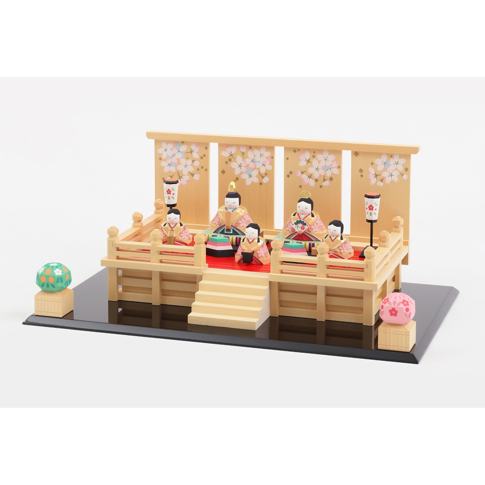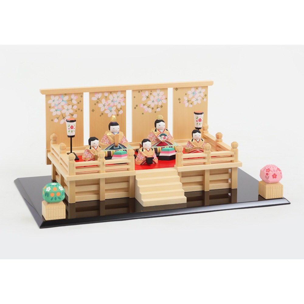 上品な桜の柄の屏風と舞台の上に、可愛らしいお人形が見事に映える豪華な一刀彫のお飾りです。