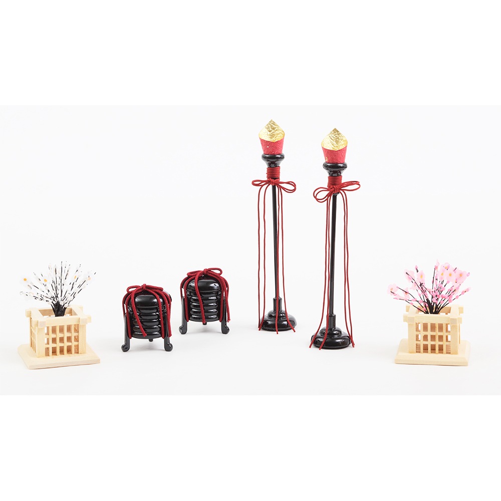 シンプルながらも上品さを感じさせる屏風に、趣のある貝桶のお道具と優美な紅白梅もお人形を引き立てる、統一感のあるこだわりのコーディネートも魅力です。