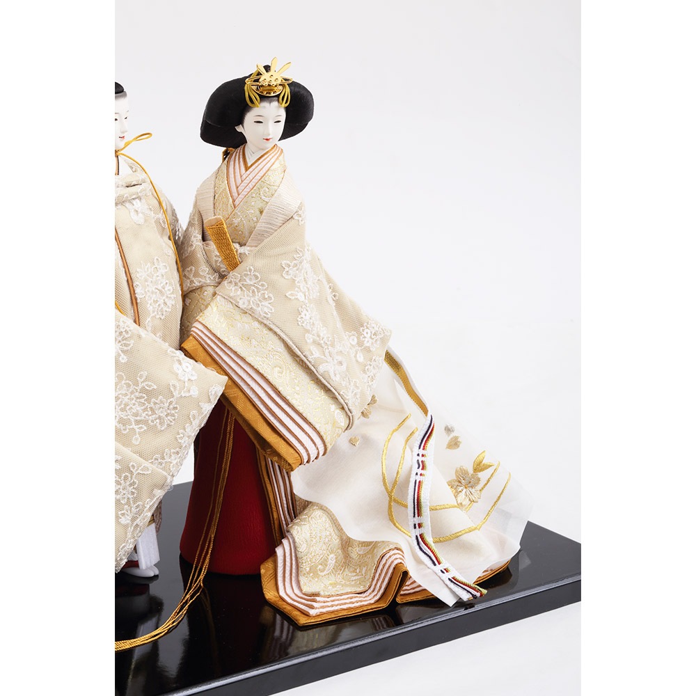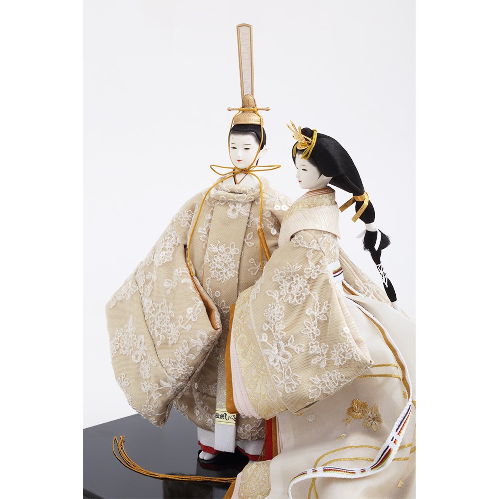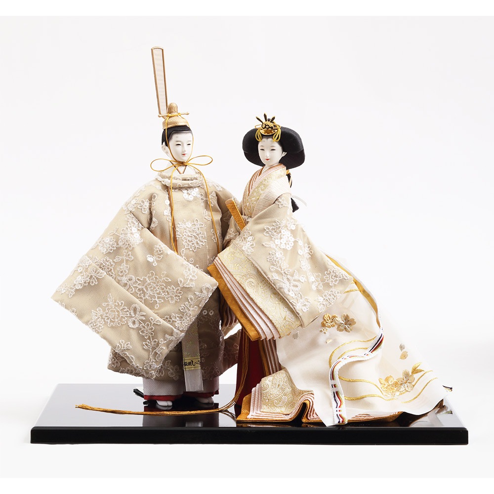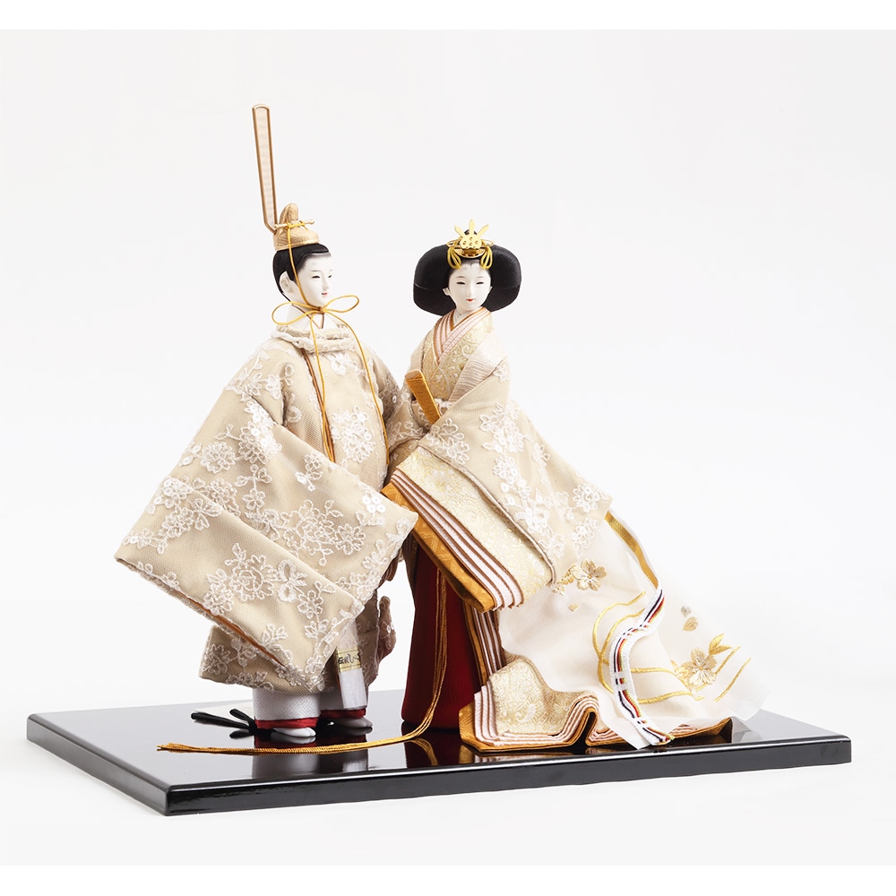 優し気に微笑む気品ある立ち姿の男雛に、暖か味のある優美な色襲(いろがさね)が素敵な女雛が、春の晴れの日のお祝いに飽きの来ない可憐な彩りを添えます。