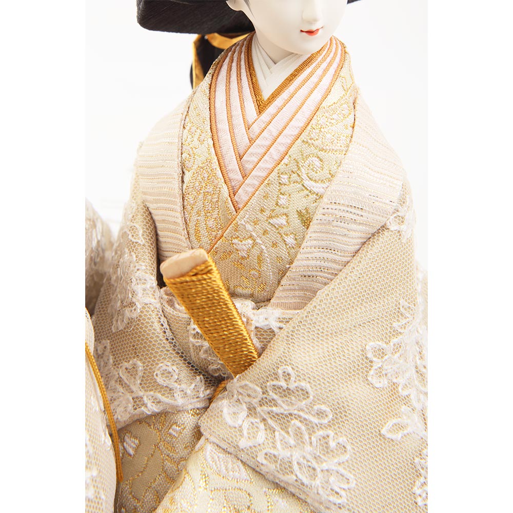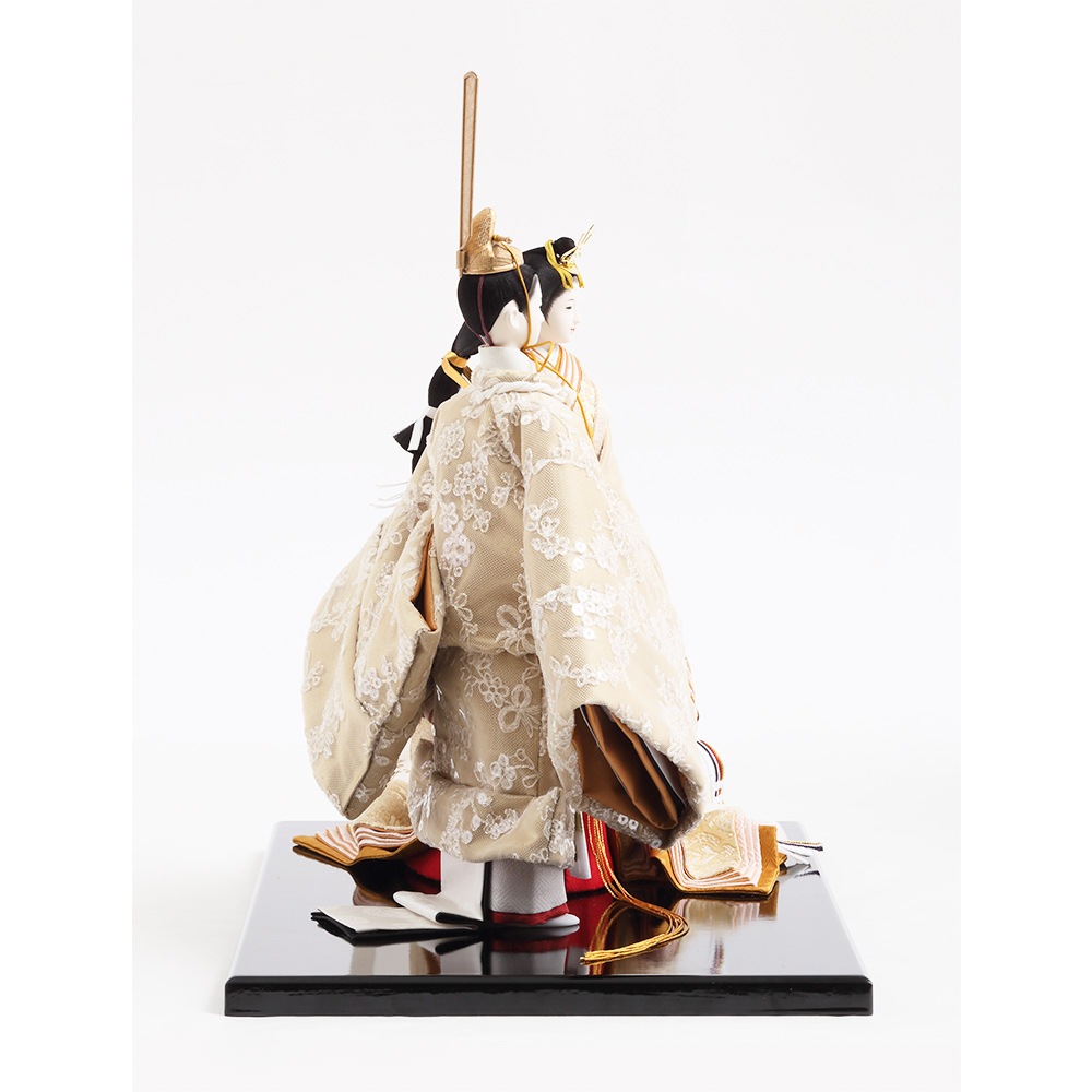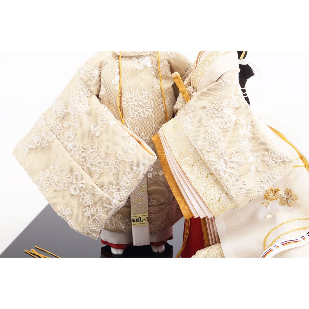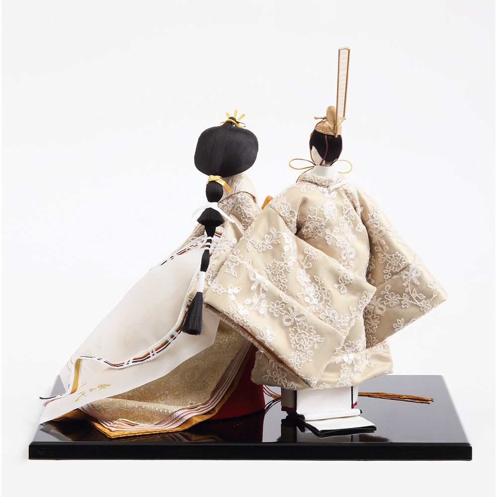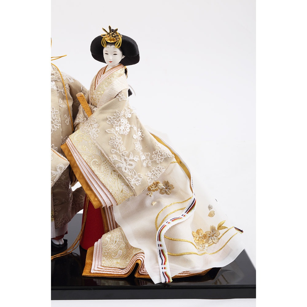 優し気に微笑む気品ある立ち姿の男雛に、暖か味のある優美な色襲(いろがさね)が素敵な女雛が、春の晴れの日のお祝いに飽きの来ない可憐な彩りを添えます。