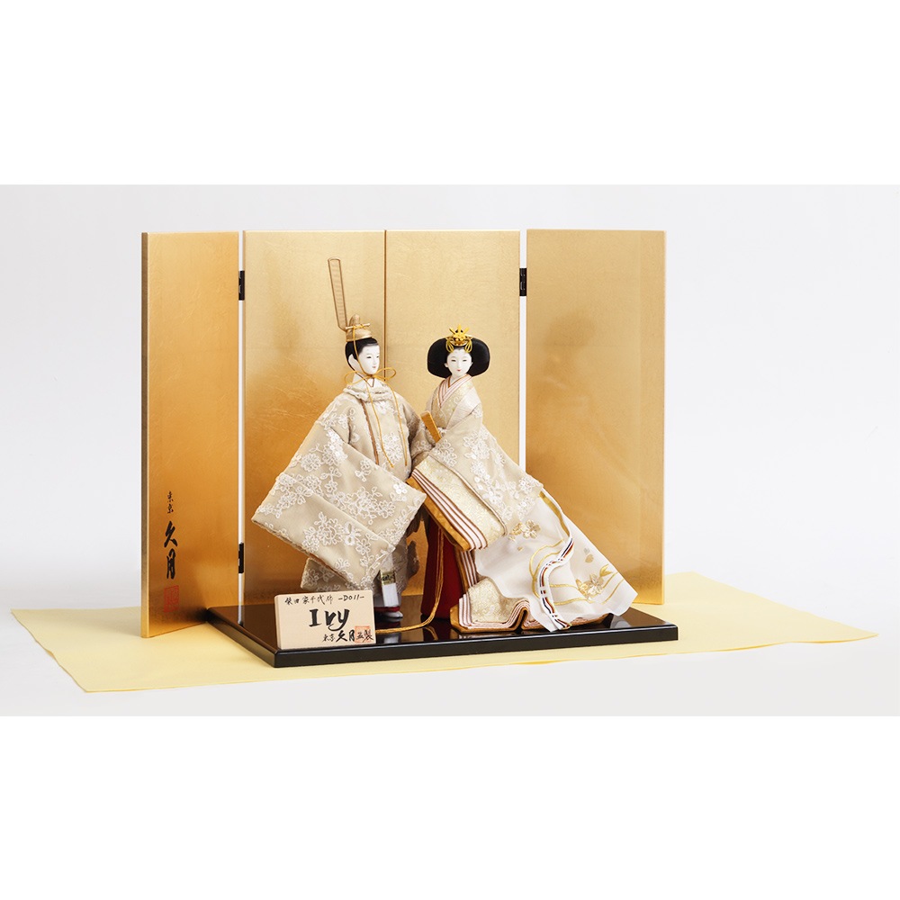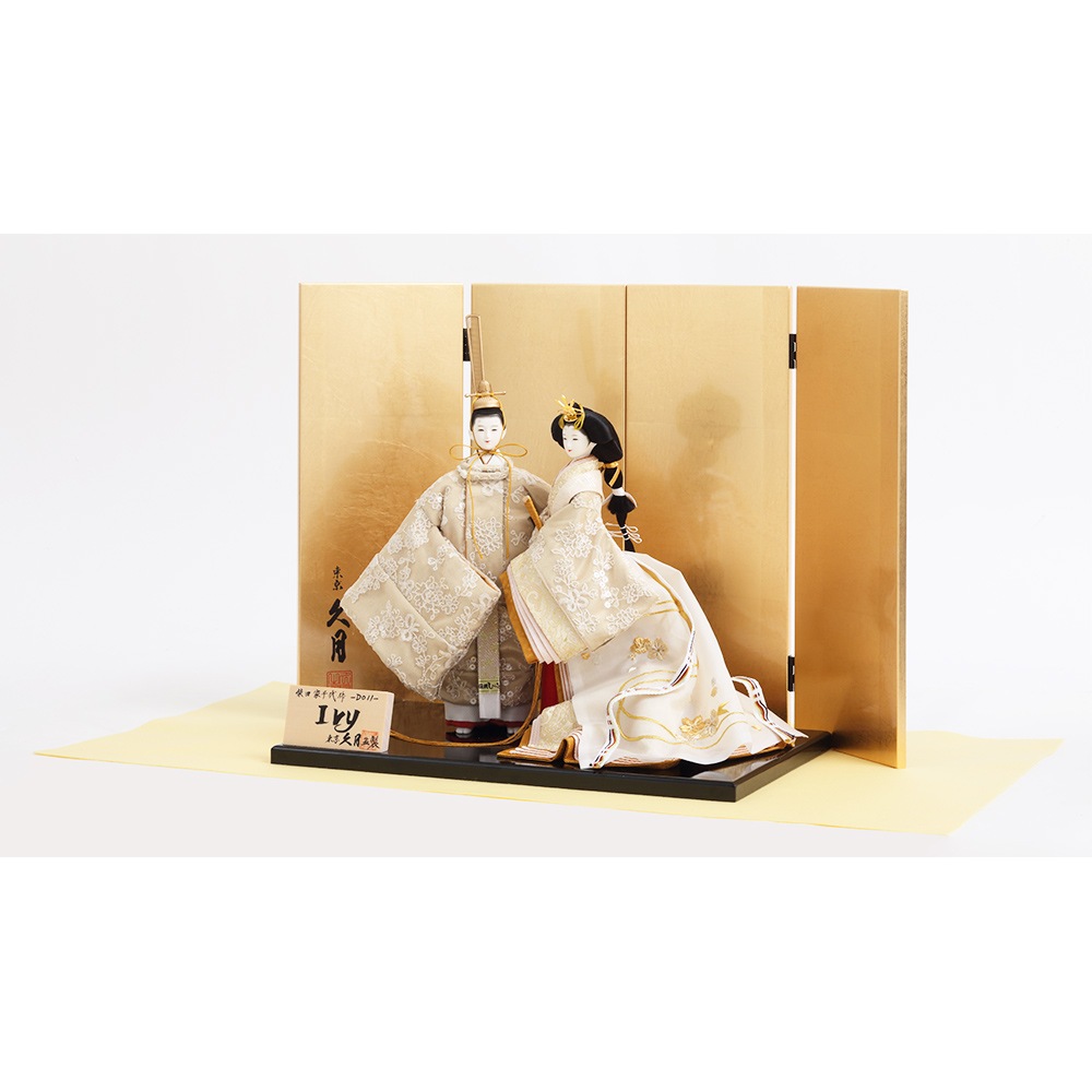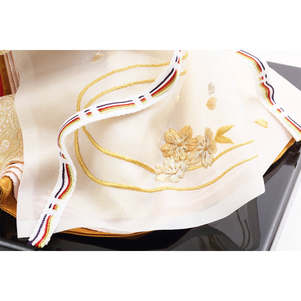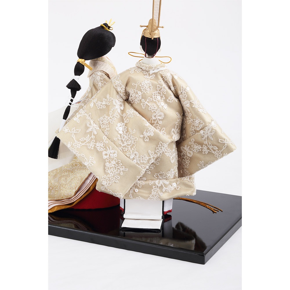 クリア塗装を施した上品に光り輝く金箔屏風に、レース生地で仕立てた美しい衣裳をまとった男雛と女雛が見事に映えます。