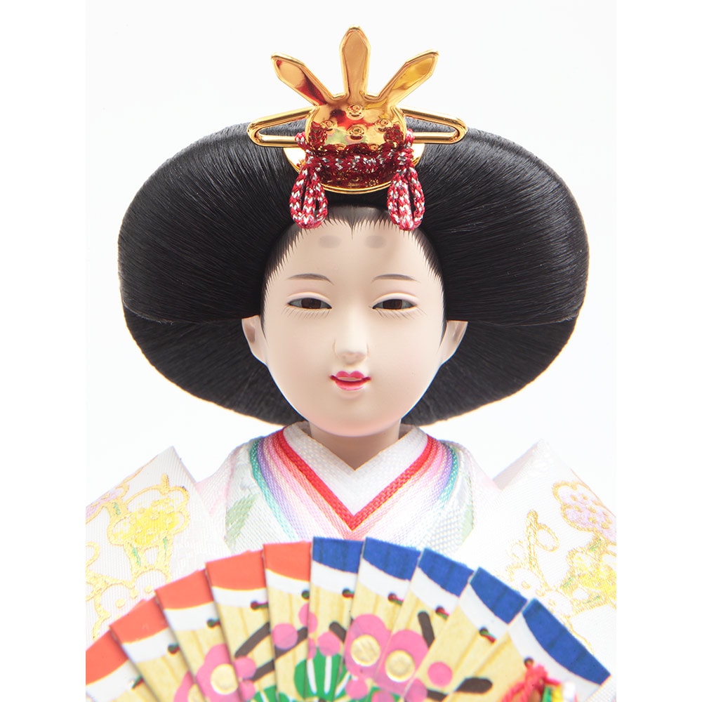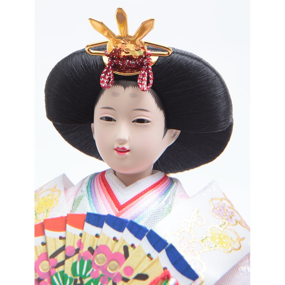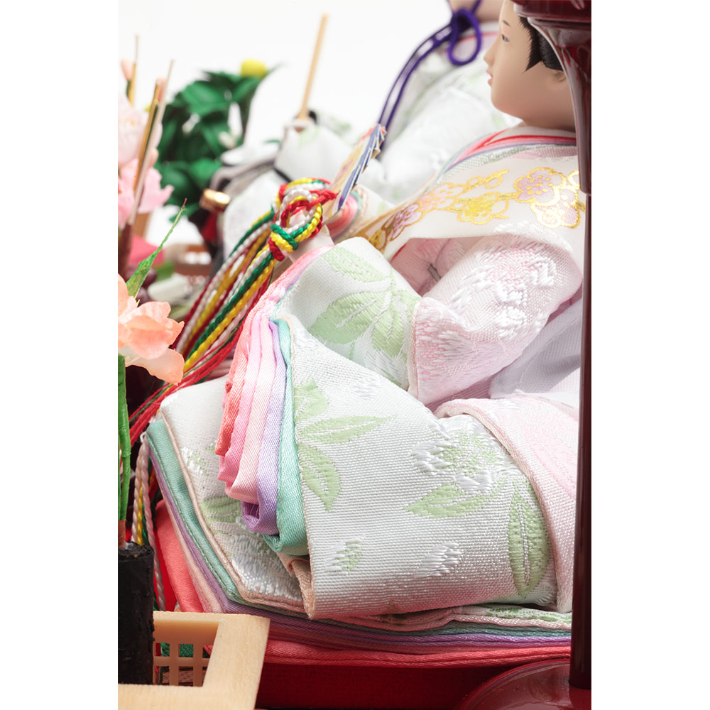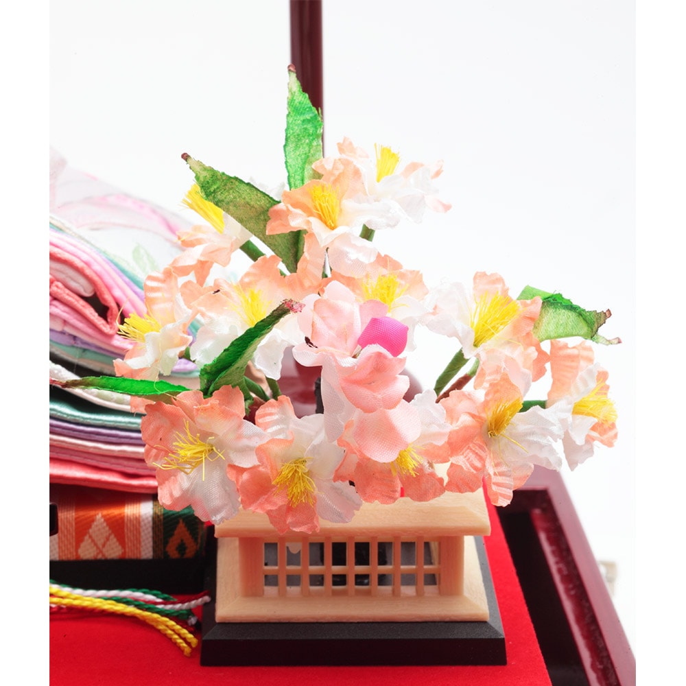 流水桜をイメージした可憐なちりめん仕立ての装飾をあしらったケース背景に、愛らしく微笑む明るく爽やかな色彩のお人形が見事に調和します。