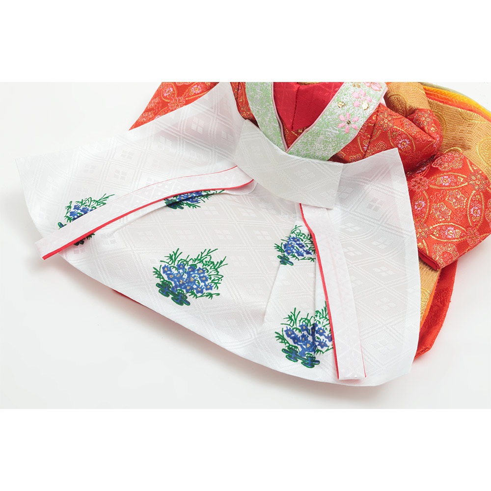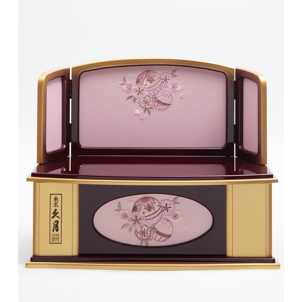優し気に微笑む雅やかな佇まいのお人形が、可憐な桜と鞠のモチーフを豪華に刺繍であしらった飾り台と屏風に美しく調和します。