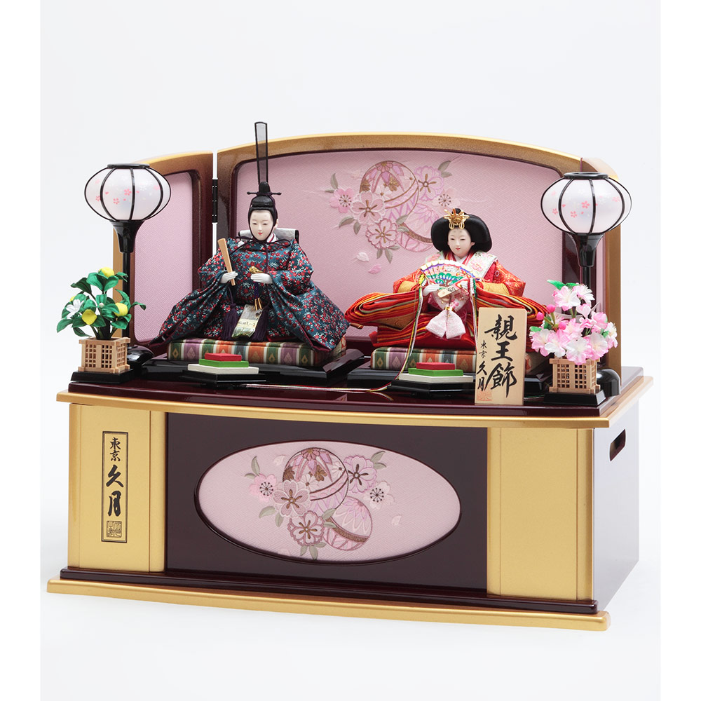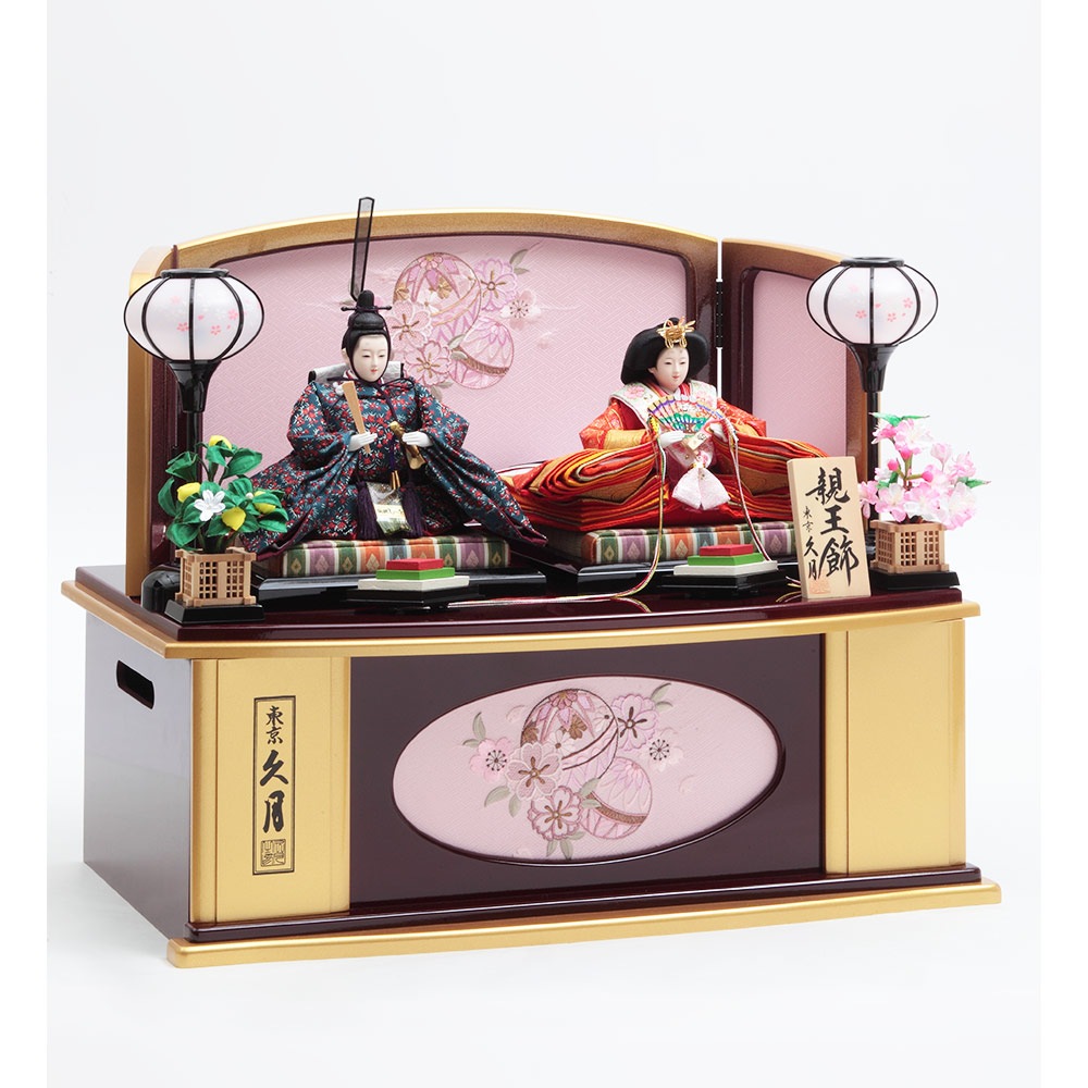 ゴールドとパープルのツートンカラーで仕上げた趣のある飾り台は、お人形やお道具類の収納ボックスを兼ねており、省スペースに仕舞える点も特長です。