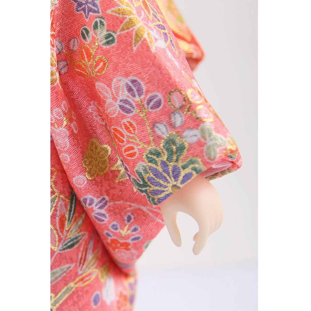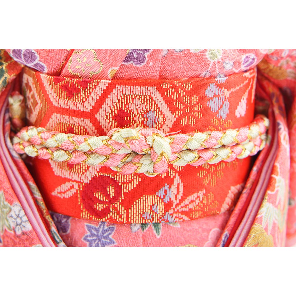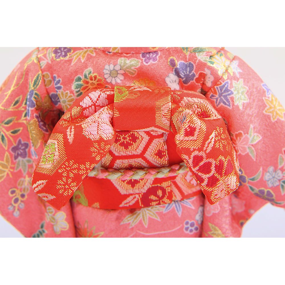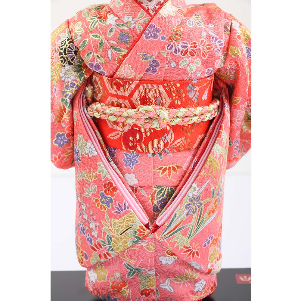様々な草花の柄が上品にちりばめられた桃色を基調とした友禅の衣裳をまとった市松人形です。