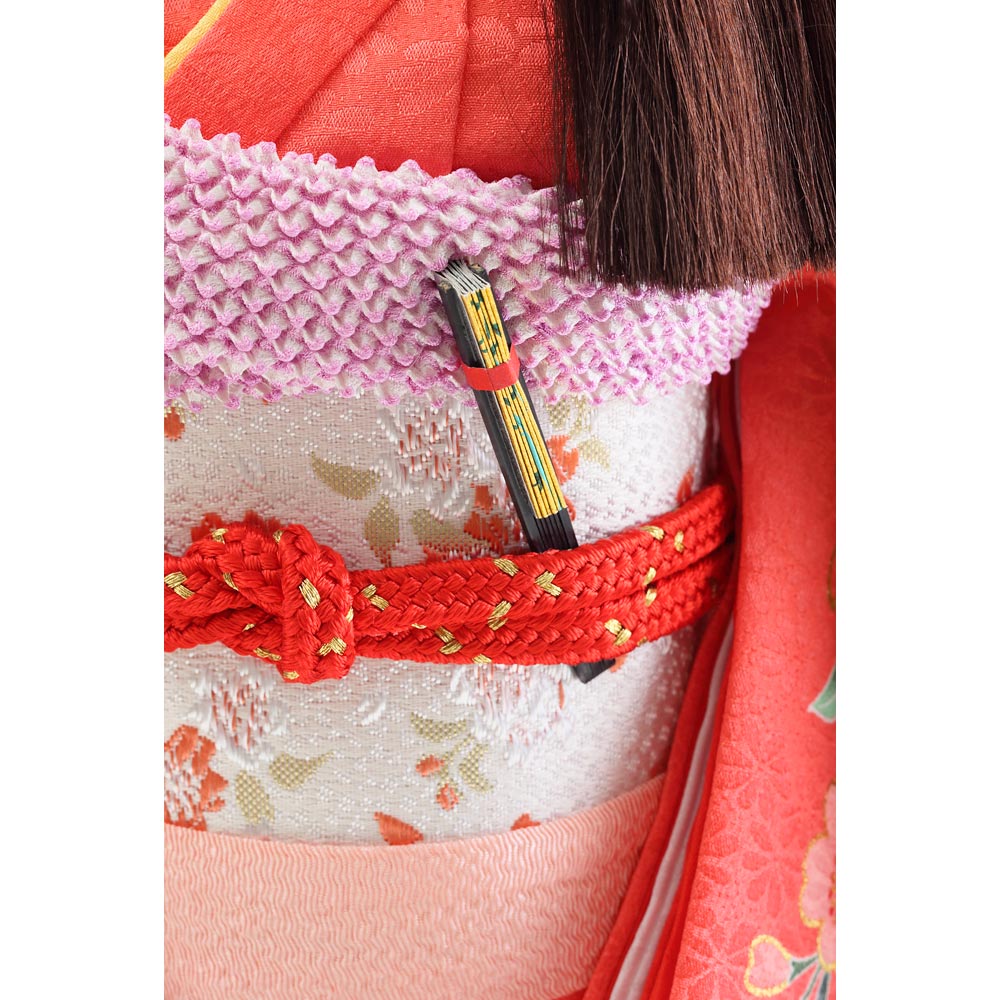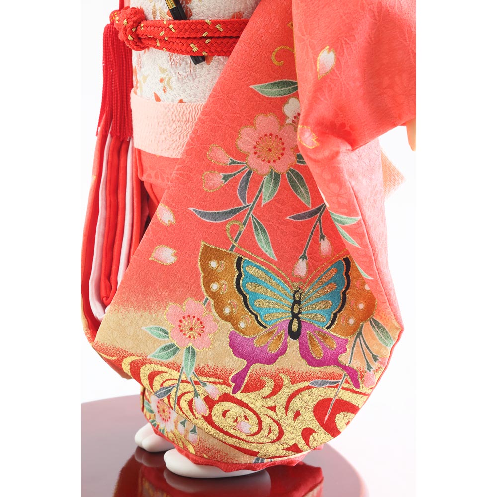 繊細な金彩が施された鮮やかな色合いの上品な衣裳が目をひく市松人形です。