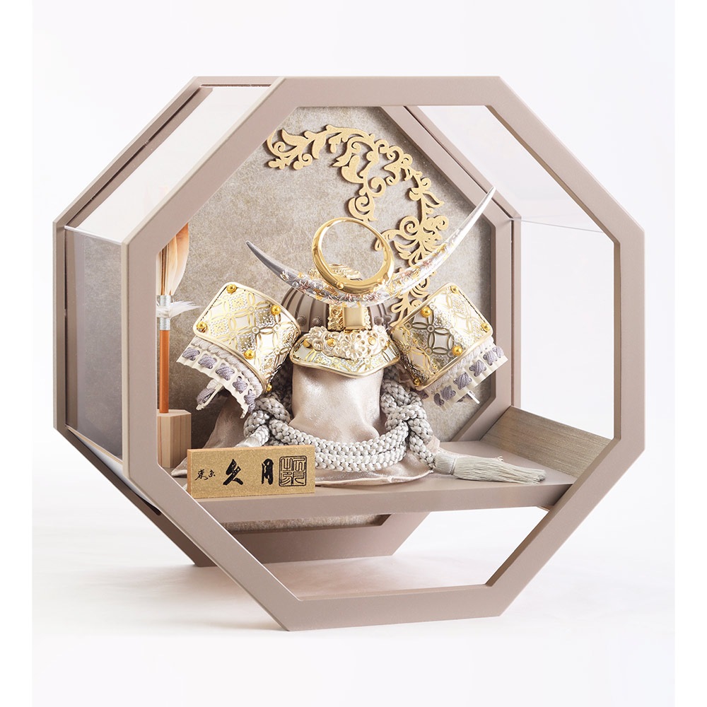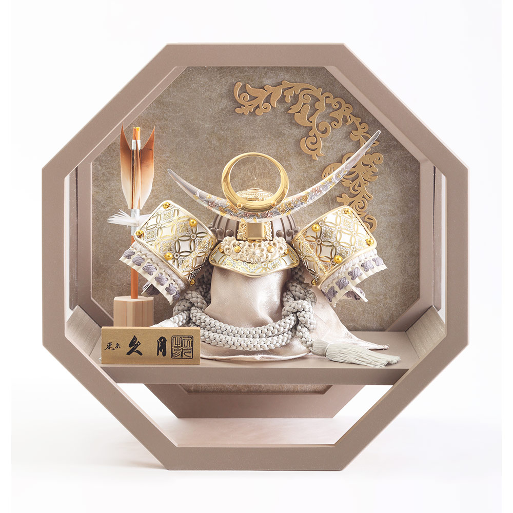 人気のモカ色で仕立てた印象的な八角ケースも、上品に光り輝く兜を一層引き立てる、和室はもちろん洋間にも違和感無く調和するケース入りの兜飾りです。