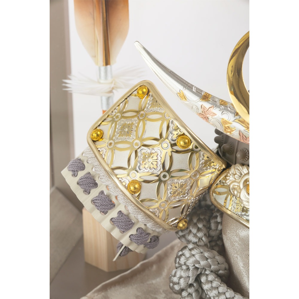爽やかな白糸縅(しろいとおどし)に白色の小札(こざね)を合わせて仕上げた美麗な佇まいの兜は、前立の三日月部分に花唐草の彫金装飾を施した、統一感のあるこだわりの仕立てが特長です。