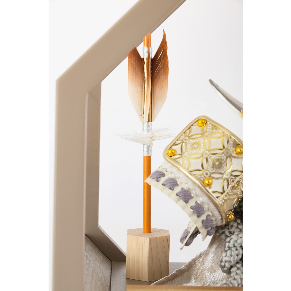 ケースと色合いを合わせたお洒落なモカ色の兜鉢や、吹き返しに施した華やかな七宝花角紋の装飾も、飽きの来ない洗練された趣を醸し出す、飾る場所を選ばないコンパクトなサイズ感も魅力の人気のお飾りです。