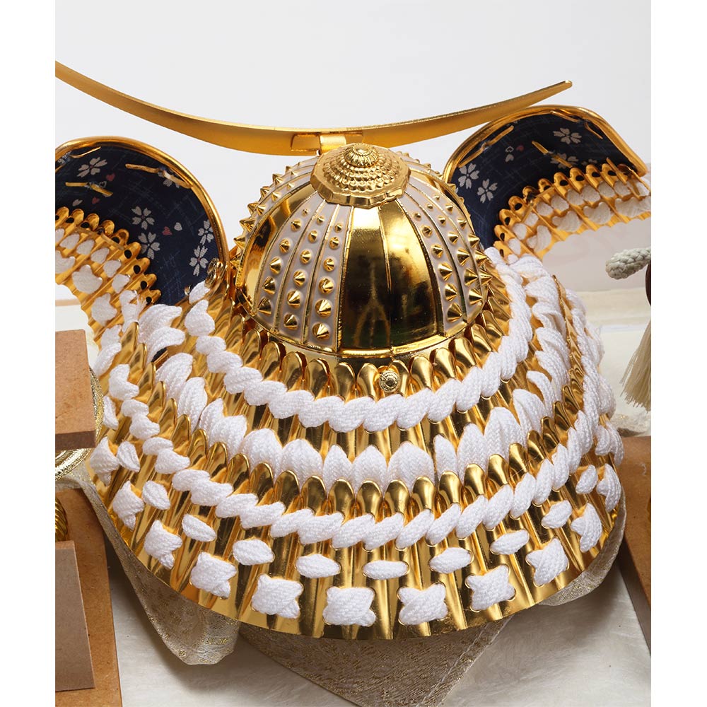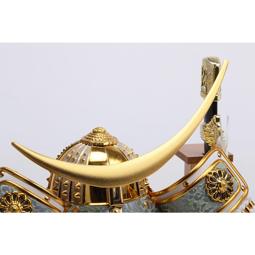 黄金色に輝く立体感のある三日月前立に魅せられる兜は、美しい白糸縅(しろいとおどし)で仕上げた気品のある佇まいが印象的で、子孫繁栄や不老長寿の意味を持つ唐草文様を表現した眉庇(まびさし)や吹き返しの仕立てと合わせて、飽きの来ない華麗で優美な風情を醸し出しています。