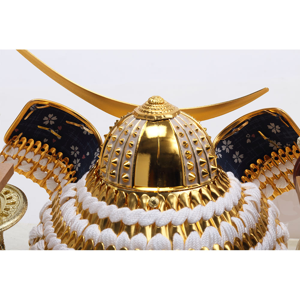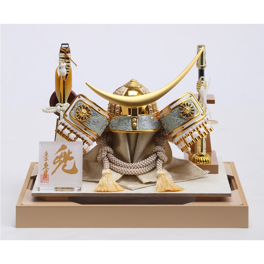 兜とテイストを合わせた華やかな袱紗や、吹き返しに据えた生命力を象徴する菊の飾り金具も、全体の華やかな雰囲気と良く調和する、名将・伊達政宗公の武勇にあやかったケース入りの兜飾りです。
