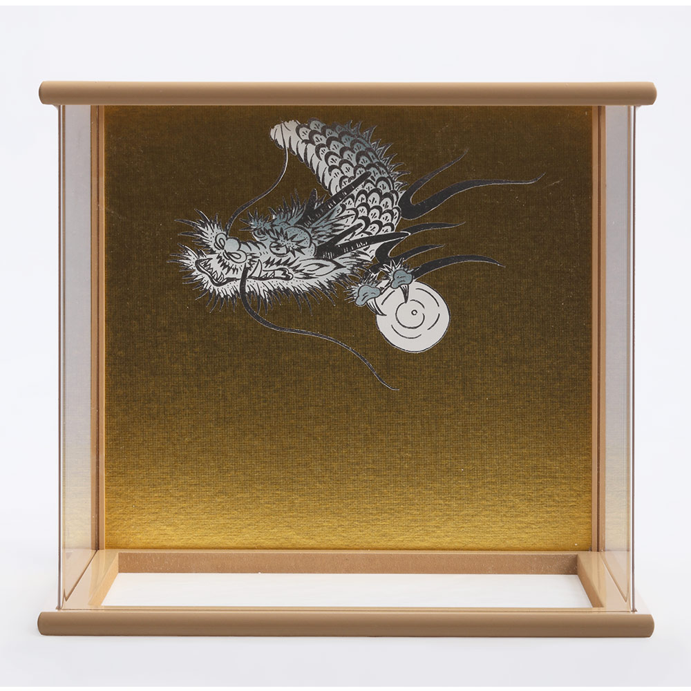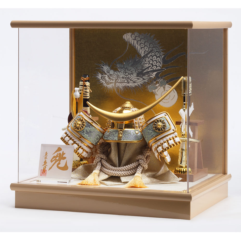 人気の戦国武将・伊達政宗公で有名な三日月前立をあしらった煌びやかな兜が、勇壮な龍を描いた風情のあるケース背景に見事に映えます。
